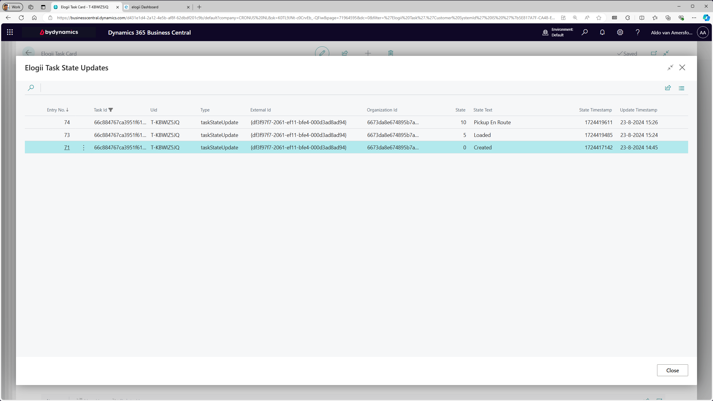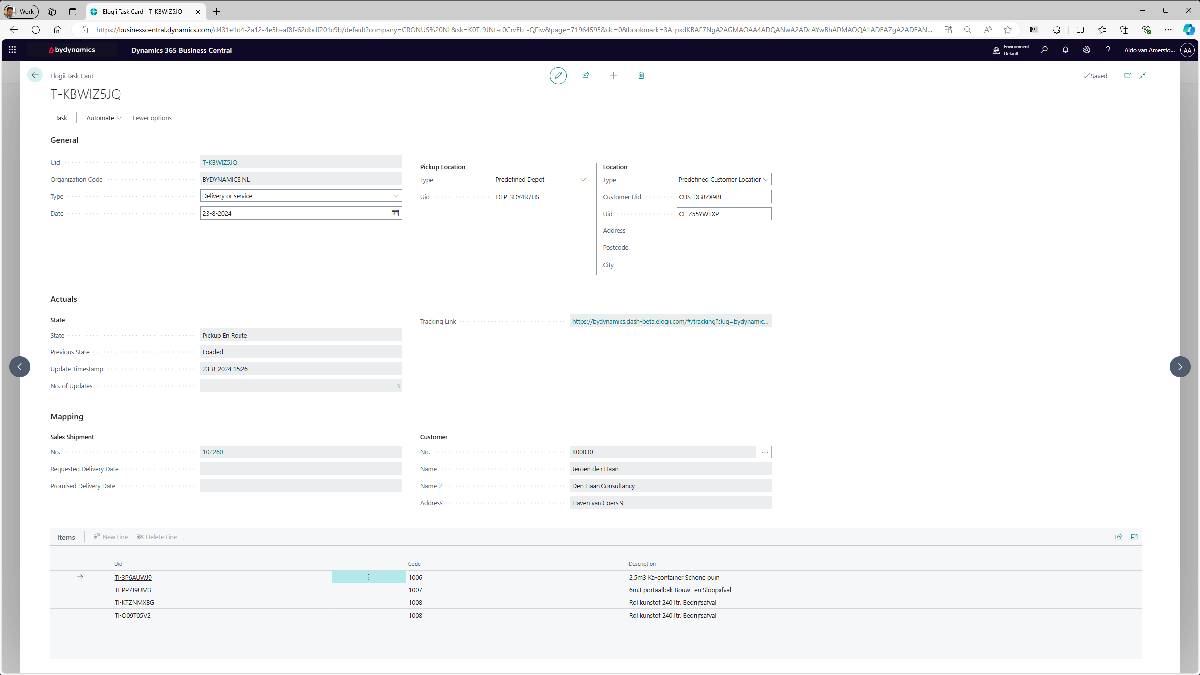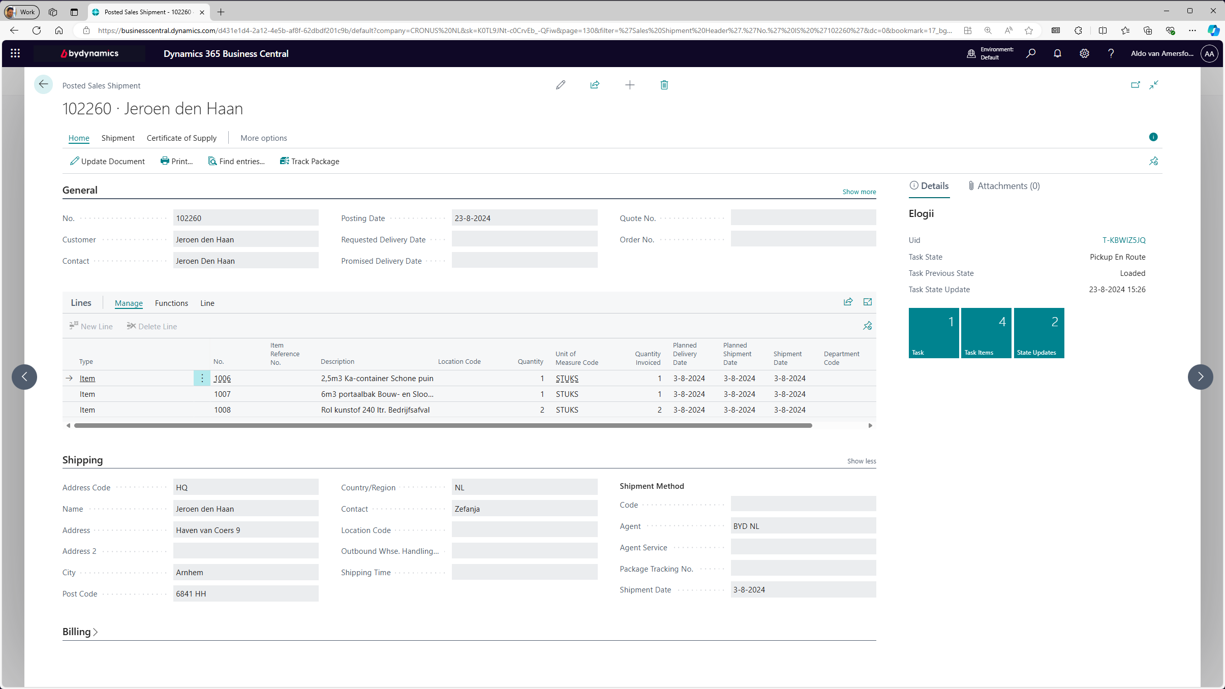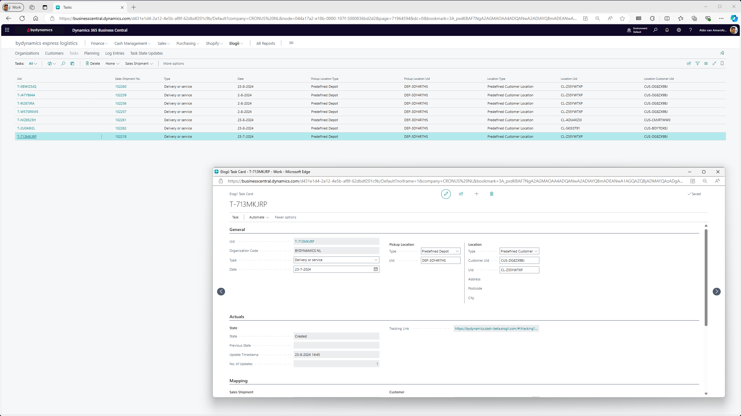 - Task state updates are visible from the Business Central Elogii task as well as the Business Central Sales Shipment